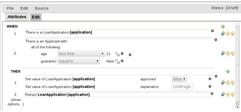 当编辑规则时,资产编辑器也称为 ”Guided Editor“。Guided Editor用于编辑商业规则语言(BRL)格式的规则。假如以下使用场景:如果一个21岁以下的申请者有贷款申请的担保人,银行可能决定批准它的贷款申请。