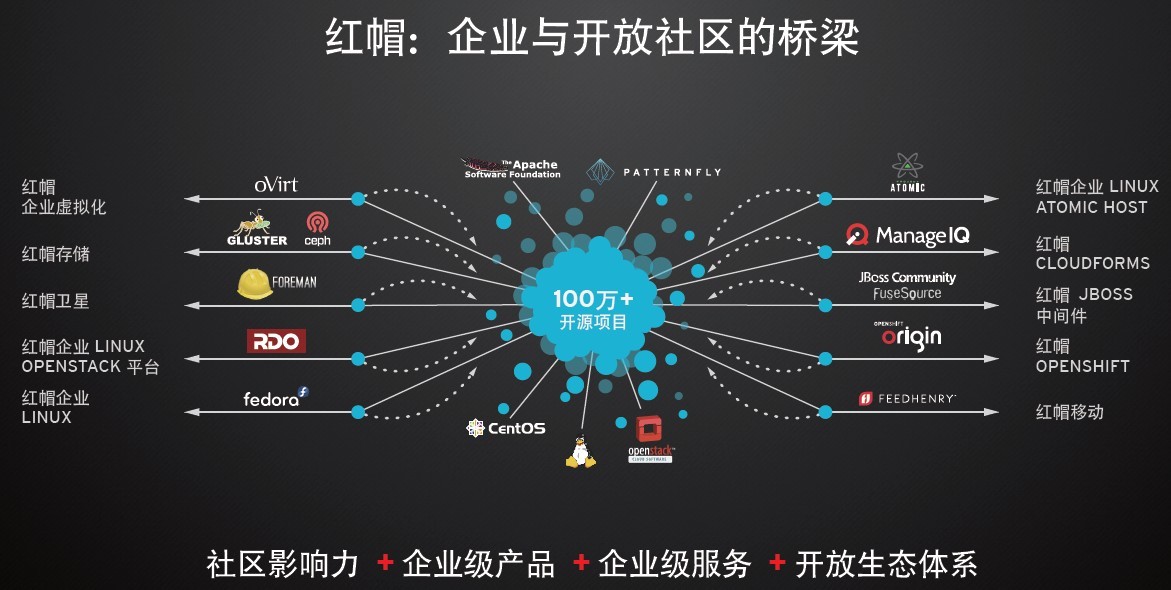 说起红帽公司,就离不开开源技术,离不开开源社区。红帽诞生于开源运动,同样开源也成就了红帽公司。在红帽CEO吉姆 ·怀特的《开放式组织》一书开篇就点名写作此书的目的:“谨以此书献给开源社区百万计的贡献者和用户,是你们成就了我们。”